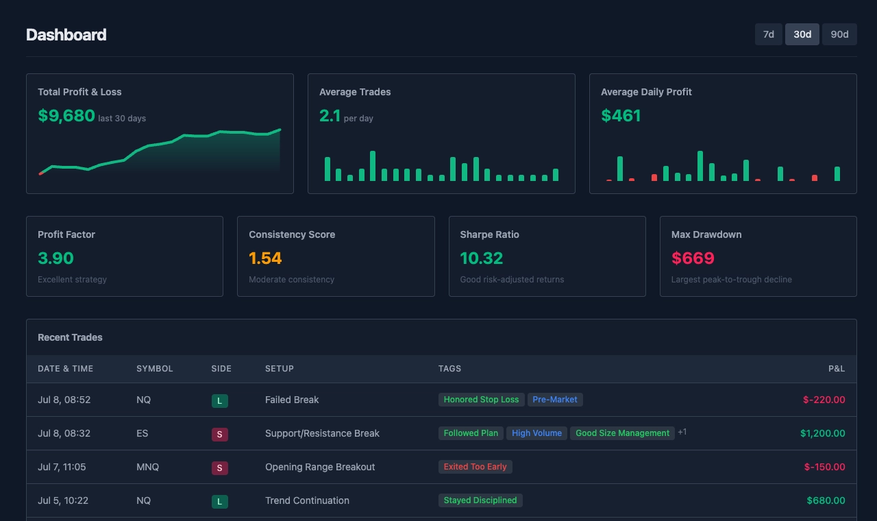 Auto-sync your NinjaTrader trades and get deep insights into your trading performance. Track metrics, identify patterns, and improve your edge.